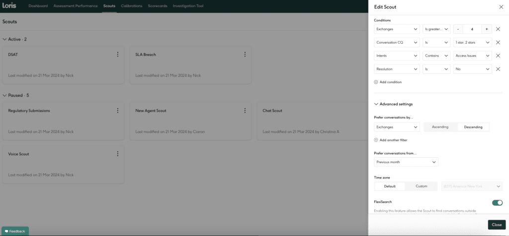 For a more programmatic approach, you can also use Resolution when you are building or editing Scouts, which is how conversations are selected for QA assessment and scoring. This way, your QA analyst teams can focus on understanding why conversations weren’t resolved instead of spending time reviewing interactions that may have indicators of customer dissatisfaction, but were ultimately resolved.