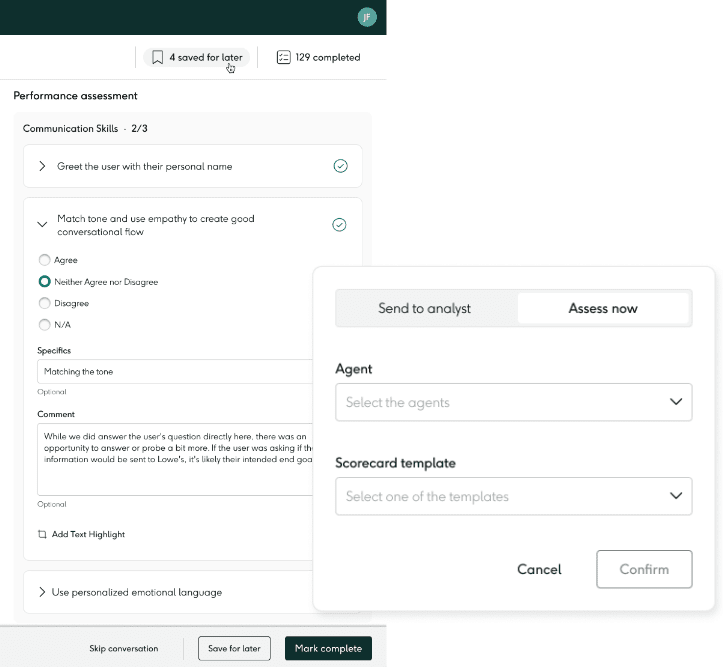 Ad Hoc Assessment & Save for Later: More flexible conversation selection and workflow so you can QA what you want, when you want