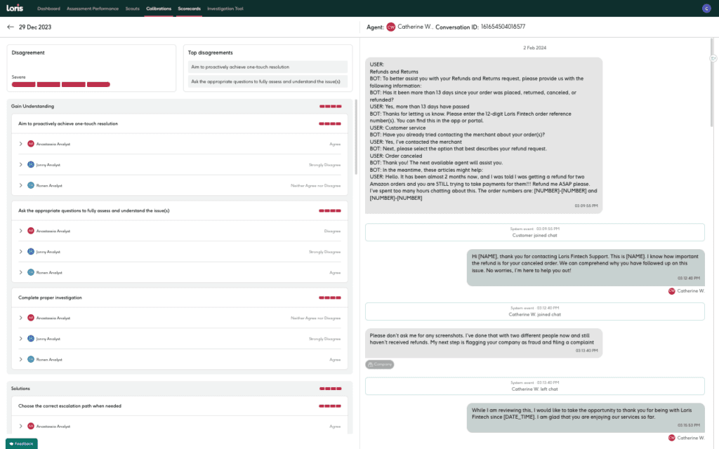 - Disputes: Surfacing and monitoring the status of scorecards where agents disagreed with the analyst’s assessment as well as if the agent manager agreed