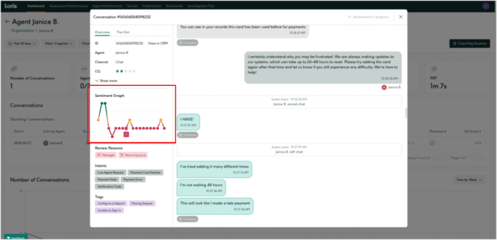 In the conversation view of our dashboard—whether it’s a live conversation or a review—you can see a sentiment map of the conversation in real-time.