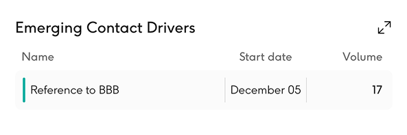 Based on the known Contact Drivers above, Loris can also detect whether a previously unknown Emerging Issue is about to impact your contact center, spotting new topics even when the number of cases is small. With this knowledge, you can understand how to address, mitigate, or remove this issue.