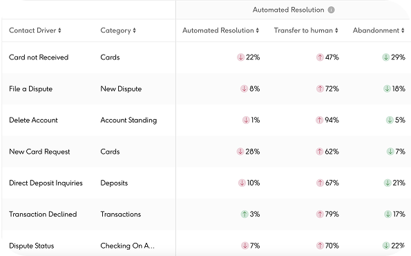 If you’re using an AI agent to increase deflection, AI Agent Insights provides valuable performance data like whether issues are actually being resolved and the impact on your customers. Using Contact Drivers to determine each intent, you can see where bots are doing well, where they need additional training, and which use cases may be too complex.